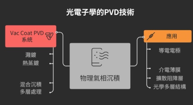 物理氣相沉積(Physical Vapor Deposition, PVD)是光電製造中的關鍵技術,能夠沉積高純度、超薄的薄膜,廣泛應用於 LED、光偵測器、顯示器以及先進半導體元件。PVD 鍍層常見應用包括: