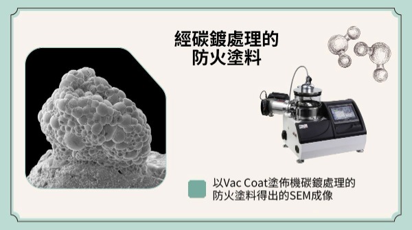 防火塗料樣品使用 Vac Coat 碳鍍系統進行碳鍍處理,以支援高品質的 SEM 成像。導電碳層可防止樣品表面帶電並提升影像清晰度,使得對材料微結構特徵的精確觀察成為可能,這對於材料性能與安全性研究至關重要。